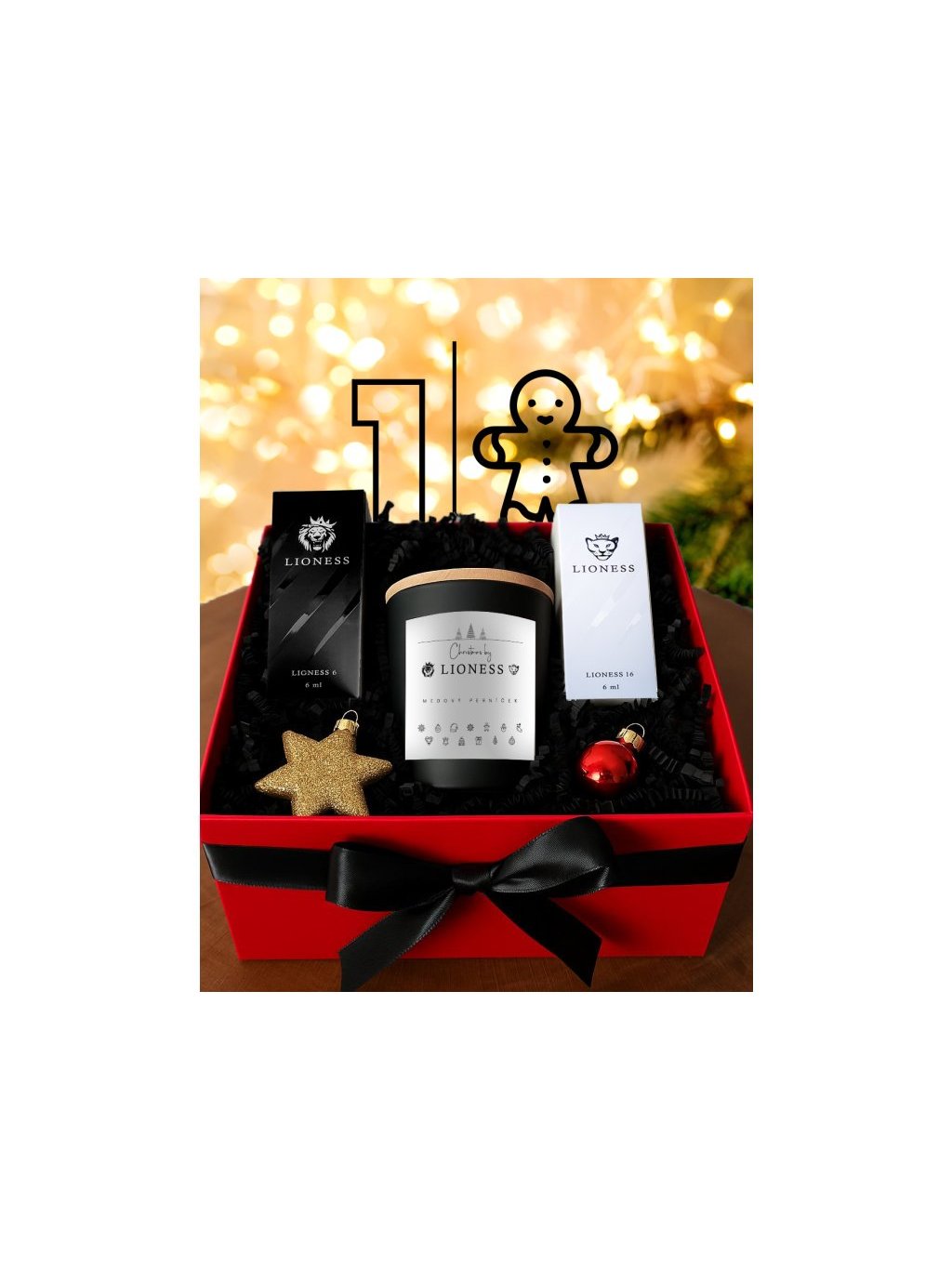 Krásný dárkový balení Lioness, který obsahuje svíčku Vánoční punč, pánskej závěsnej flakon Lioness 4 (Chanel - Bleu de chanel) a dámskej Lioness 11 (YSL - BLack opium). Balíček je zabalenej v elegantní vánoční červený krabičce.