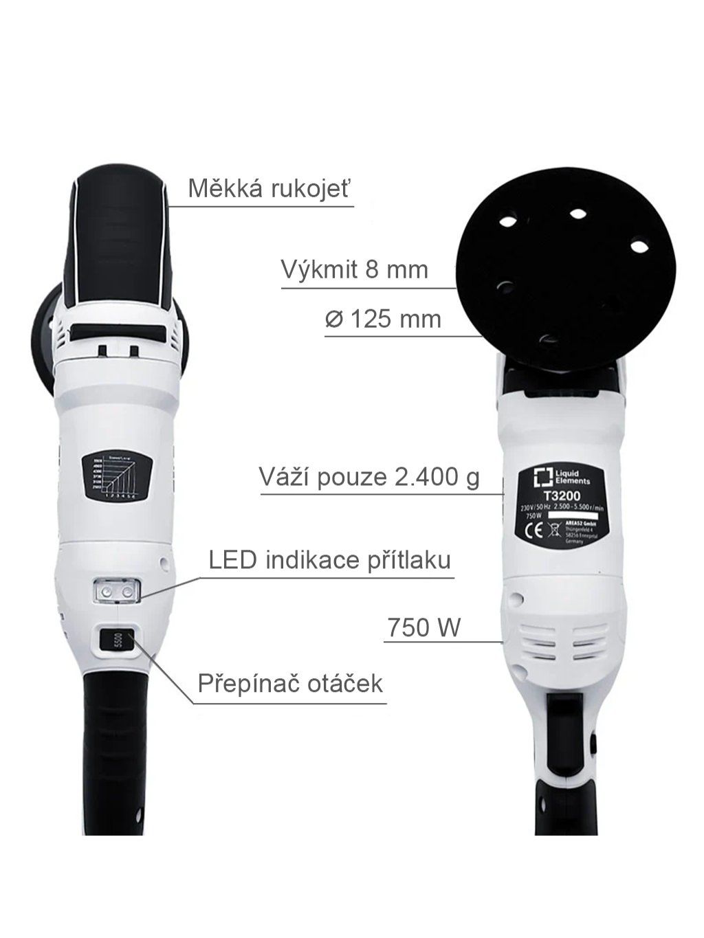 Excentrická leštička Liquid Elements T3200 V3 s výkmitem 10 mm se standardně dodávanym unašečem o průměru 125 mm a výkonem 750 W. Leštička je vhodná jak pro hobby použití, tak i pro profesionální detailery. Díky vysokýmu výkonu motoru je zajištěný konstantní udržení otáček při leštění na náročnejch sekcích karoserie. Pokud seš absolutním nováčkem nebo profesionálním detailerem, tato strojní leštička je pro svou cenu, výkon a kvalitu zpracování ideálním pomocníkem při leštění laku. Leštička Liquid Elements T3200 V3 se může pyšnit moderním designem těla, příjemným úchopem a robustní elektronikou. Dvě LED diody na horní straně leštičky signalizujou správnej rozsah vyvíjenýho tlaku během procesu leštění. Pokud se rozsvítí zelená LED dioda, tlak je dostatečnej, ale pokud se rozsvítí červená LED kontrolka, tlak na povrchu je příliš velkej a je potřeba ho okamžitě snížit.