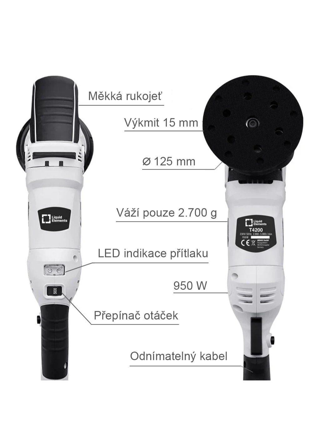Orbitální leštička Liquid Elements T4200 s 15 mm kmitem, výkonem 950 Watt, indikací tlaku na povrch a odnímatelným napájecím kabelem.