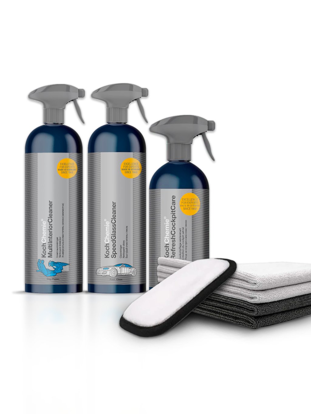 Kompletní set autokosmetiky do interiéru, kterej ti zajistí dokonalou péči o tvou káru. Obsahuje čistič oken pro křišťálově čistý skla bez šmouh, univerzální čistič, kterej bezpečně a efektivně odstraní špínu a skvrny z různejch povrchů, a impregnaci plastů, která oživí barvy a ochrání materiály před opotřebením. Tvůj interiér bude nejen čistej, ale i svěží a upravenej do posledního detailu.