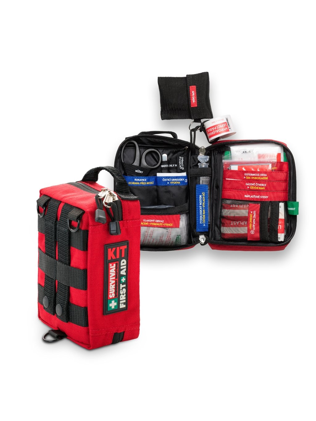 SURVIVAL First Aid KIT – Small je nejkompaktnější lékárnička z celý řady SURVIVAL, navržená pro každodenní nošení i rychlý použití na cestách. Přestože je malá, překvapí svym promyšlenym systémem: výbava je rozdělená do barevně označenejch sekcí podle typu zranění a každá kapsa má jasně čitelnej popis, díky kterýmu okamžitě víte, kam sáhnout. Každá položka má svý pevný místo, kapsy jsou mělký a přehledný, a textový štítky ti napovídaj, jakej materiál použít. To výrazně usnadňuje orientaci i ve chvílích, kdy je potřeba jednat rychle. Small KIT tak podporuje rychlou, sebevědomou a logickou reakci v krizový situaci, i když nemáš žádný zdravotnický zkušenosti. Díky kompaktním rozměrům se perfektně hodí do batohu, auta, na výlety, na kolo i do kanceláře.