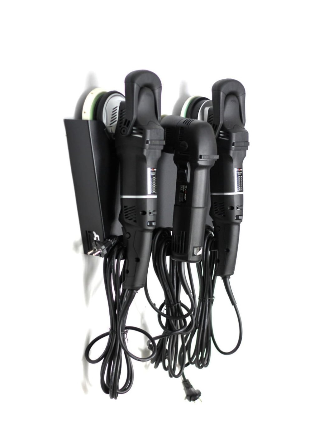 Vysoce kvalitní držák na tři leštičky s úchyty na kabely, díky čemuž zaberou velmi málo místa. Držák je vhodný jak pro DA, tak rotační typ stroje s unašeči o velikosti 30 - 180 mm. Montážní otvory pro přišroubování na zeď jsou umístěny v horní části police, díky tomu zaručují naprostou stabilitu. Držák je vyroben z kvalitního kovu, který je nalakován práškovou barvou, která chrání proti oxidaci.
